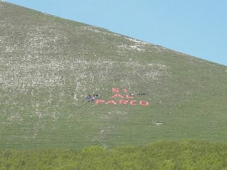 sul versante del Monte Acuto una grande scritta in stoffa con il testo