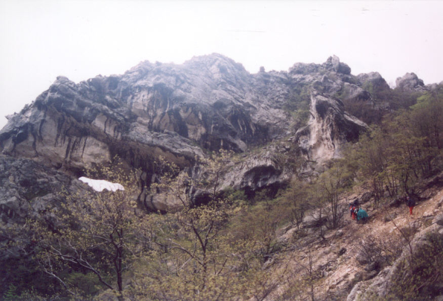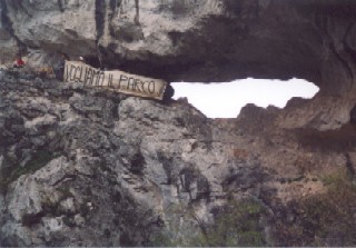 vista della Balza Forata dal ghiaione su cui si inerpica il sentiero. |