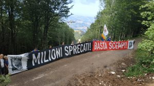 La contestazione ai lavori di potenziamento degli impianti da sci sul massiccio del Monte Catria da parte di alcune Associazioni ambientaliste, si arricchisce di un altro episodio. Sabato scorso un gruppo di trenta volontari, sotto lo sguardo attento del gestore del rifugio “Le Cotaline”, ha steso uno striscione di circa 20 metri, con la scritta “SOLDI SPRECATI – BASTA SCEMPI”, in prossimità di alcune delle otto piste da sci che il Comune di Frontone ha deciso di allargare e allungare o realizzare ex novo sulle pendici del Monte Acuto.